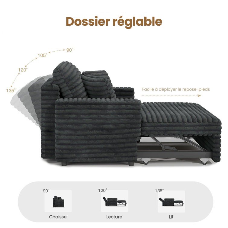 Design 3 en 1 : Sert de fauteuil, de méridienne ou de lit une place, idéal pour les appartements ou petits espaces.
