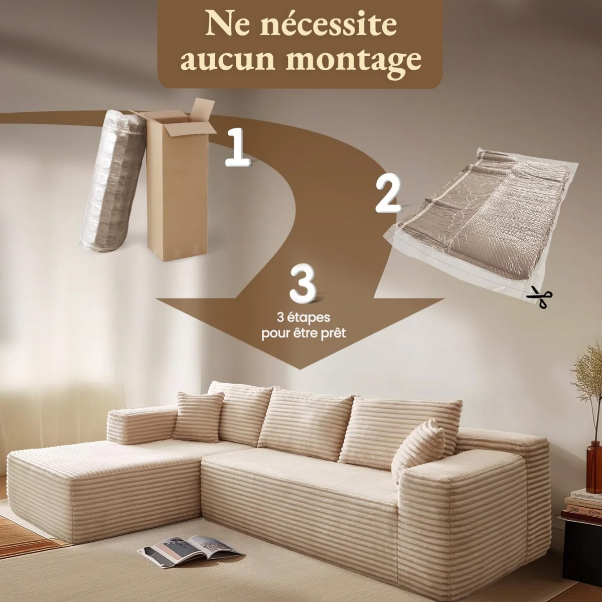 Montage simplifié : Oubliez vis et tournevis ! Il suffit de sortir chaque module de sa boîte, de tapoter légèrement pour qu’il reprenne son volume et de laisser le canapé retrouver sa forme en quelques heures (jusqu’à 72 h pour un gonflage complet).