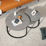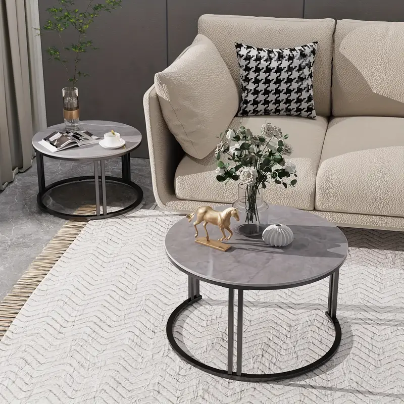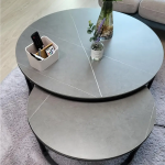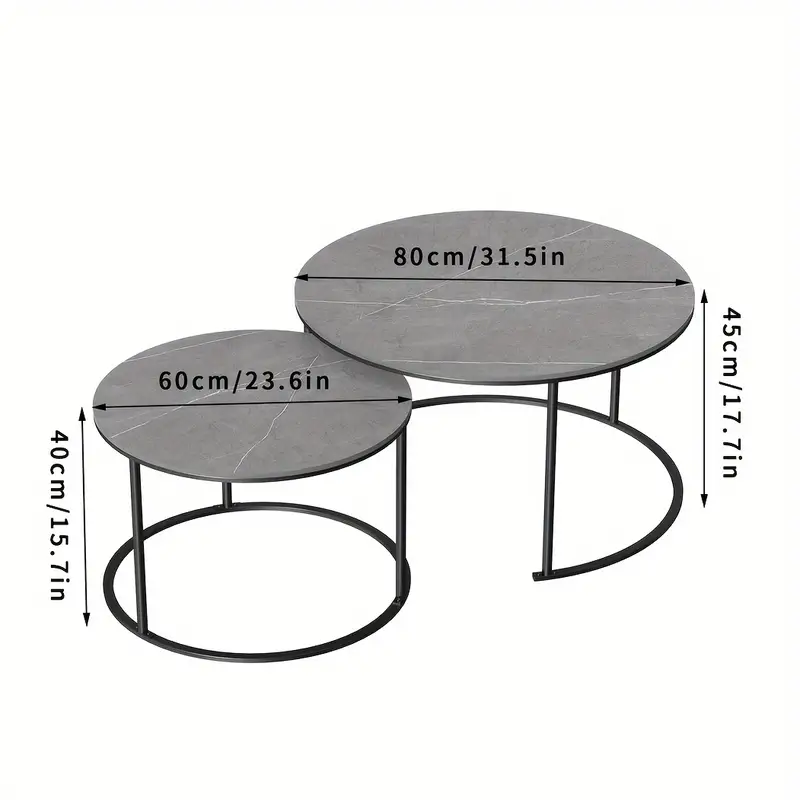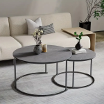 Caractéristiques: Lot de 2 tables basses rondes empilables, pieds en métal noir. Fabriquées en panneaux de particules mélaminés, double face, avec tubes en métal noir. Dimensions du produit : Longueur : 80 cm x Hauteur : 45 cm – Poids net : 9,05 kg.