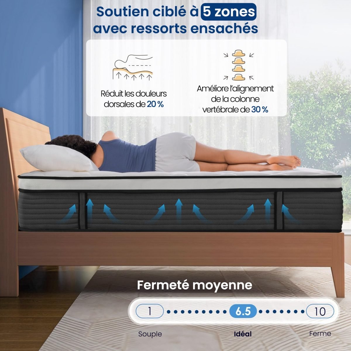 Conçu pour allier soutien précis, fraîcheur et durabilité, ce matelas hybride combine mousse à mémoire de forme et ressorts ensachés pour un sommeil réparateur et une excellente indépendance de couchage.